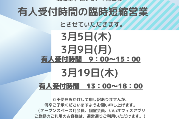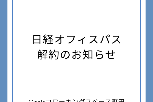 お得な情報や耳寄りの情報を発信! オアシスからご案内やイベントのお知らせなど発信しております。 2026.02.27 お知らせ 有人時間短縮営業のお知らせ 2026.02.20 お知らせ 日経オフィスパス利用終了のお知らせ 2026.02.13 お知らせ 消防設備点検のお知らせ 2026.01.08 お知らせ オープンスペースに大型モニターを3台新設しました! 2026.01.06 お知らせ 新年のご挨拶 2025.12.05 お知らせ 年末年始無人営業のお知らせ 2025.12.04 お知らせ エアコン清掃実施のお知らせ 2025.11.19 お知らせ オープンスペースご利用時の衛生面へのご協力のお願い 2025.07.29 お知らせ お盆期間中の営業日と有人受付時間短縮のお知らせ 2025.06.20 お知らせ 【料金改定および座席レイアウト改善のお知らせ】 2025.06.18 お知らせ いいオフィスシステムメンテナンスのお知らせ 2025.04.21 お知らせ 断水工事のお知らせ 1 2 3 4 5 6